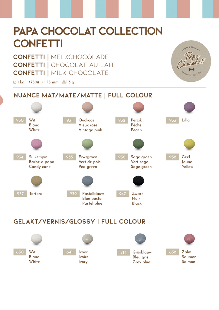 Kleuren op een beeldscherm kunnen licht afwijken van de realiteit. Suikerbonen en snoep kunnen niet geruild of geretourneerd worden. PAPA CHOCOLAT verandert op regelmatige basis hun collectie/kleuren. Sommige kleuren verdwijnen, nieuwe worden toegevoegd. We proberen de lijst zo up to date mogelijk te houden.