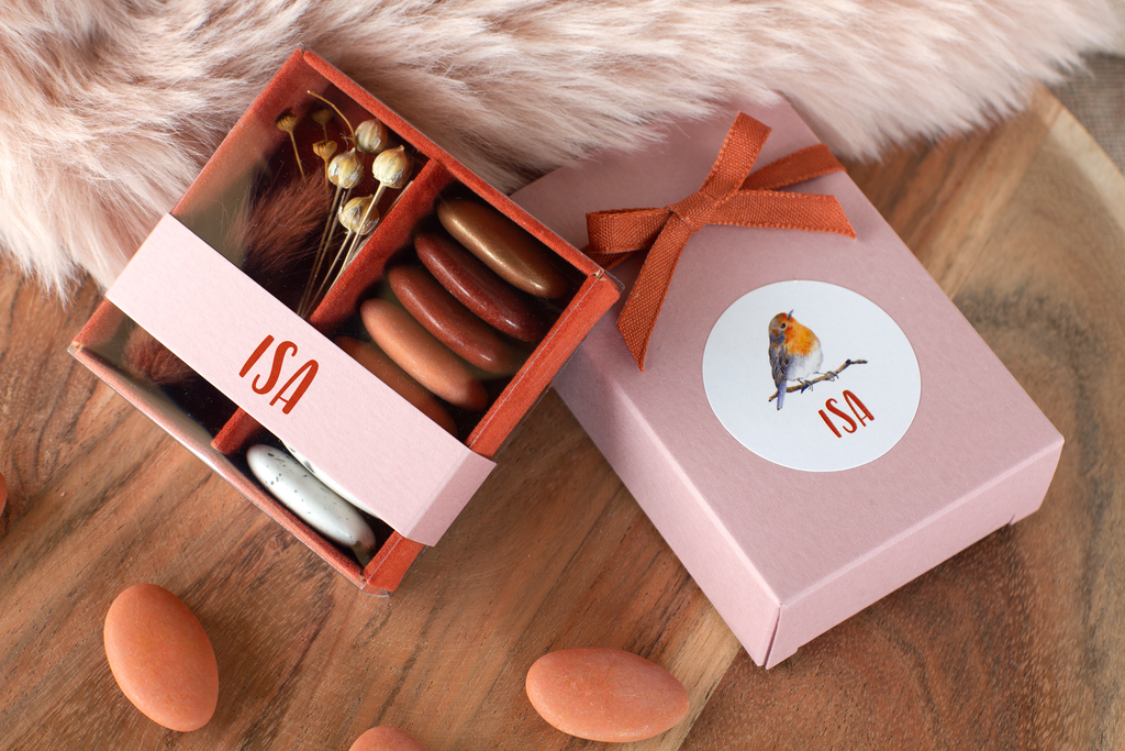Combineer de doosjes met een vierkanten of ronde sticker van 40 mm, vinylstickers, label, ... .