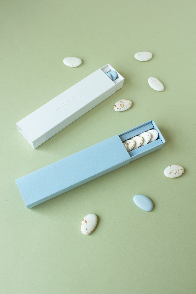 Schuifdoosje lang met inlegstuk (met inlegstuk geschikt voor 10 à 11 suikerbonen). Je kan er ook voor kiezen het inlegstuk niet te gebruiken. In dat geval kan er meer in het doosje. De minimale oplage voor de doosjes is 10 ex. Daarna kan je per 1 ex bijtellen.
