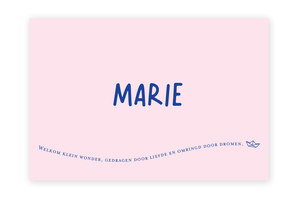 Het kaartje maken we op voorhand helemaal klaar met jullie tekst, wensen, … die jullie via mail bezorgen. Vlak na de geboorte bezorgen jullie mij de laatste gegevens 'gewicht, grootte, …'.