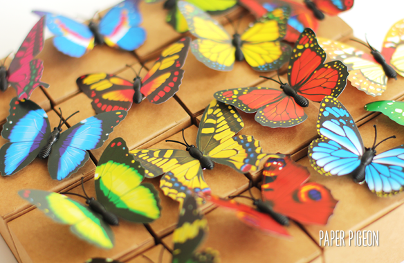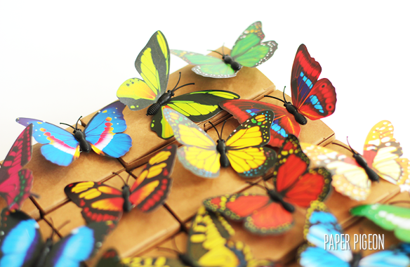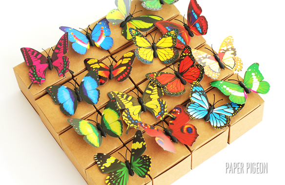 Combineer de vlinders met kraft-doosjes en een ronde vlinder-sticker van 38 mm.