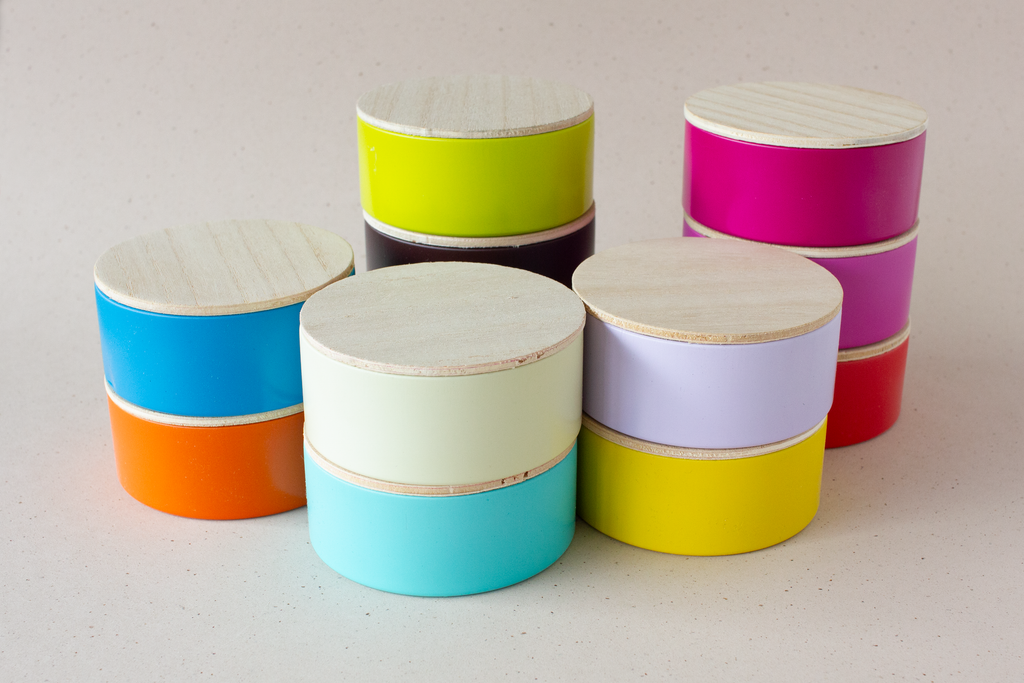 Mat metalen blikjes met houten deksel.