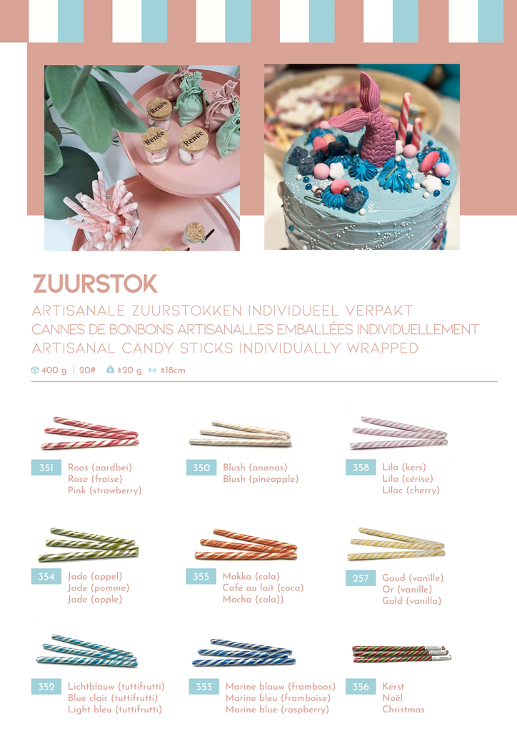 Artisanale zuurstokken individueel verpakt met opvallende kleuren en aangepaste smaken - in tubes van 20 st x 20g.