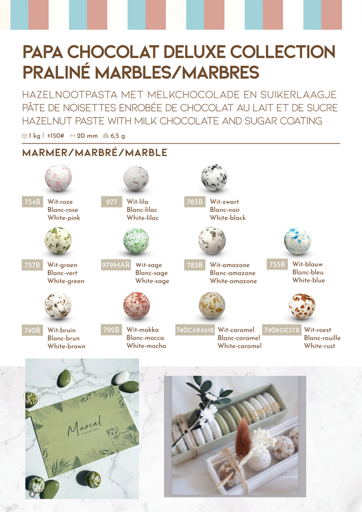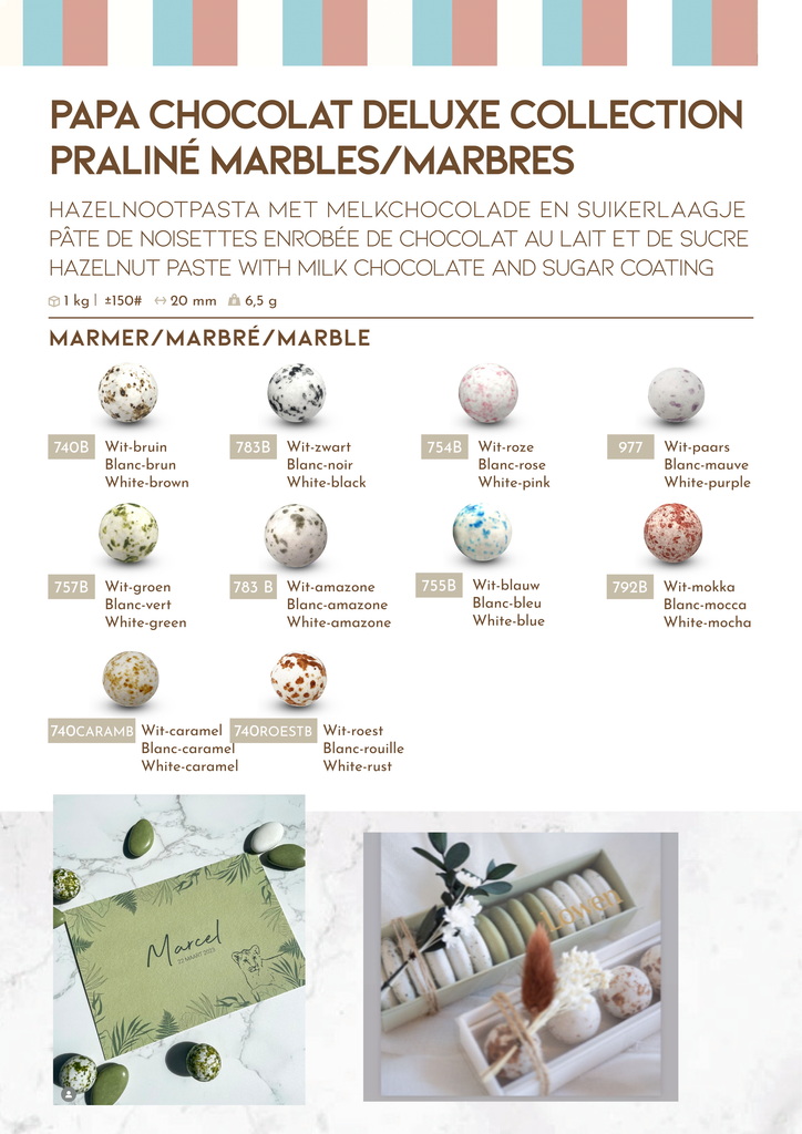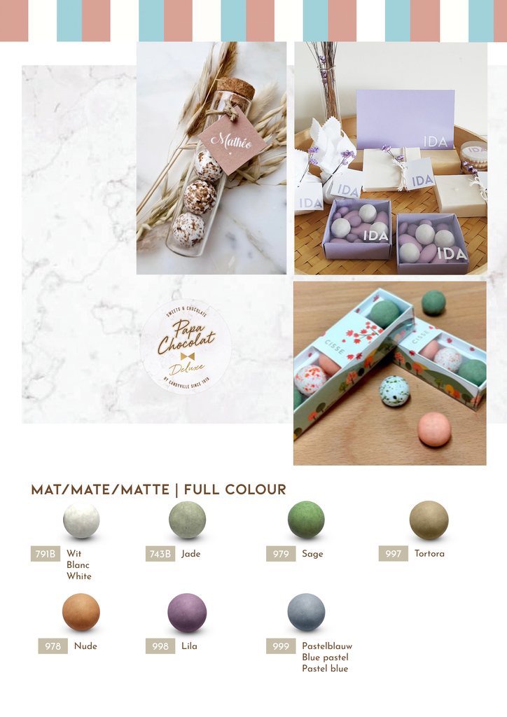 Kleuren op een beeldscherm kunnen licht afwijken van de realiteit. Suikerbonen en snoep kunnen niet geruild of geretourneerd worden. PAPA CHOCOLAT verandert op regelmatige basis hun collectie/kleuren. Sommige kleuren verdwijnen, nieuwe worden toegevoegd. We proberen de lijst zo up to date mogelijk te houden.