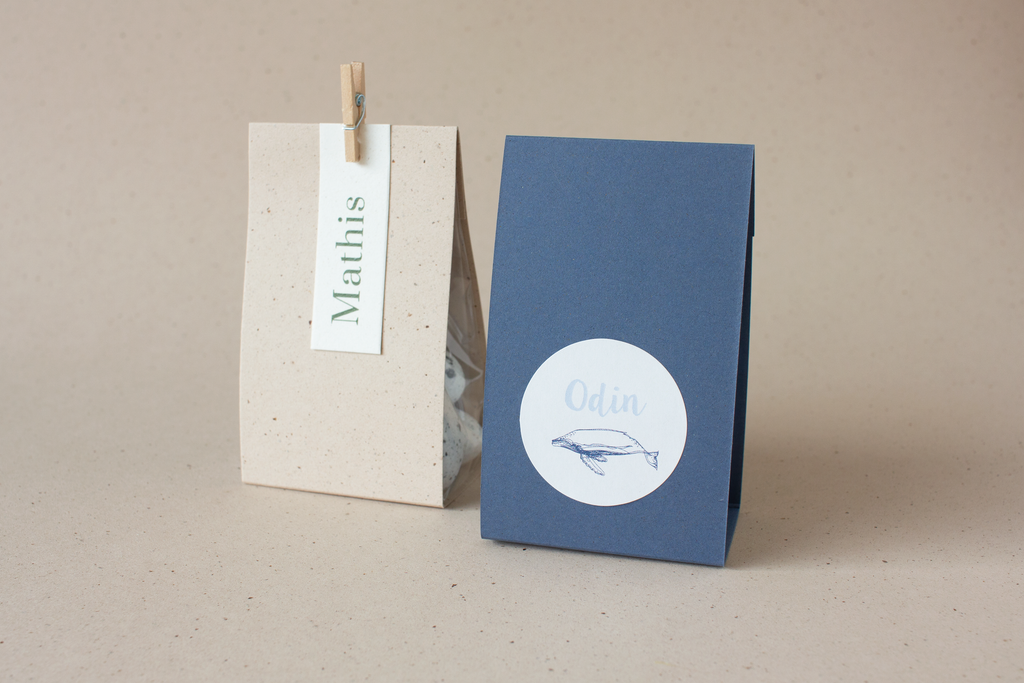 Blokbodemzakje XS met omslagkarton in indigoblauw (rechts op de foto), lot van 34 ex. Sluit de wikkels met een strip dubbelzijdige tape, clip, wasknijper, ... (niet inbegrepen).