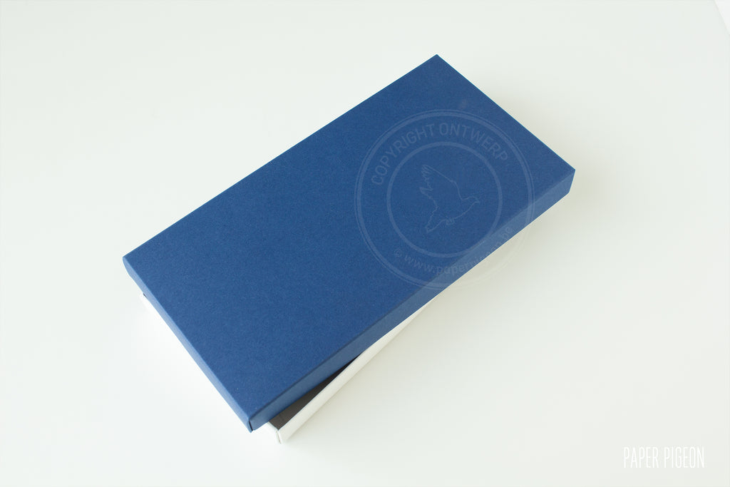 Langwerpige lage dekseldoos. Deze doos die zich onder andere ideaal leent voor cadeaubonnen kan ook verkregen worden met wikkel in plaats van deksel. Prijs op aanvraag.