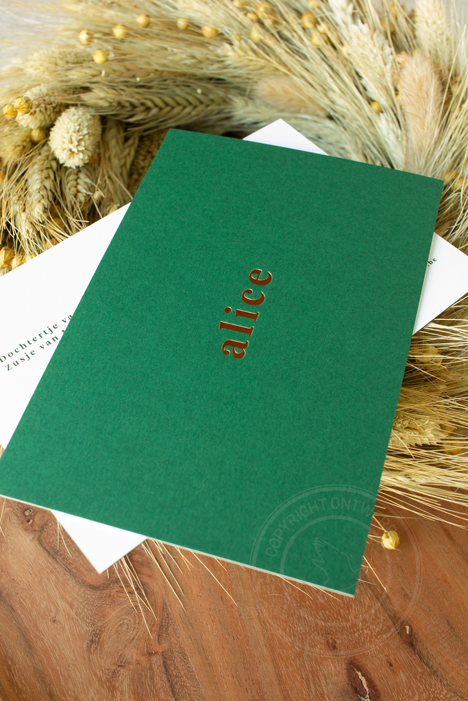 Geboortekaartje Alice - koperfolie op cactusgroen karton