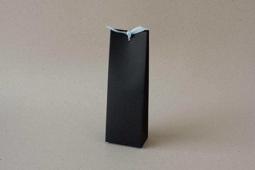 Hoge doosjes - zwart. Er zit een klein gaatje bovenaan het doosje om de zakjes eventueel met een lint of koord te sluiten. De minimale oplage is 10 ex.